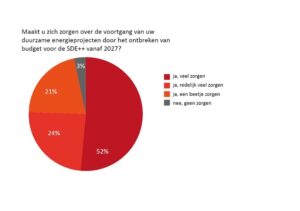 Bijna alle bedrijven met duurzame energieprojecten zijn (zeer) bezorgd over het feit dat er vanaf 2027 geen budget meer is gereserveerd voor de SDE++-regeling. Driekwart van de bedrijven verwacht dat de ontwikkeling van nieuwe duurzame energieprojecten halveert of zelfs stil komt te liggen. “Nederland dreigt hierdoor heel veel oranje-groene energie en economische kansen mis te lopen en langer afhankelijk te blijven van fossiele import uit onbetrouwbare landen. Terwijl stabiel beleid bedrijven juist vleugels geeft,” zegt Olof van der Gaag, voorzitter van de Nederlandse Vereniging Duurzame Energie (NVDE), die een inventarisatie onder bedrijven uitvoerde. De NVDE roept de formerende partijen op om de eerdere bezuiniging van 1 miljard euro op de SDE++-regeling terug te draaien.