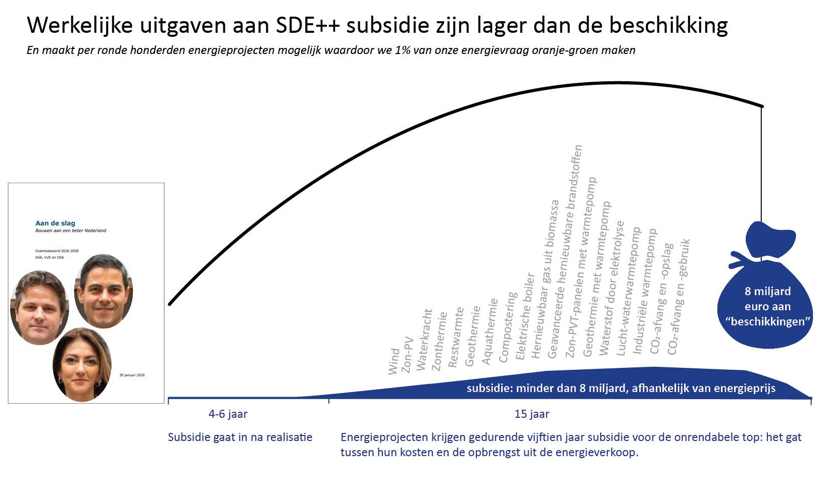 Coalitieakkoord: We verlengen de SDE++ met zes nieuwe openstellingsrondes voor de uitrol van duurzame energiebronnen. Het betreft een jaarlijks openstellingsbudget van 8 miljard euro t/m 2032.
