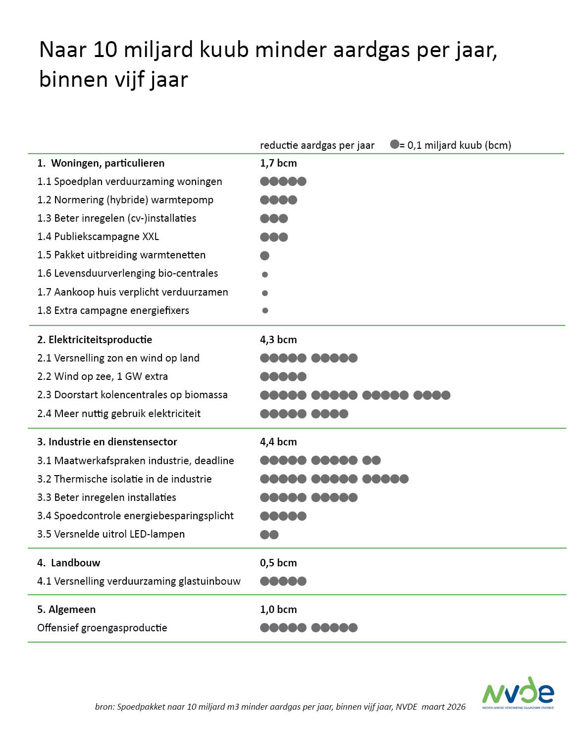 Nederland heeft in zijn geschiedenis laten zien dat het niet wacht tot anderen het voor ons oplossen. We bouwen onze eigen dijken, we regelen ons eigen water, we lossen onze eigen problemen op, in samenwerking met anderen. Dat kan nu ook. In haar nieuwe ‘Spoedplan voor minder aardgas’ presenteert de NVDE een pakket maatregelen waarmee Nederland in circa vijf jaar tien miljard kuub aardgas per jaar kan besparen. Dat is evenveel als we nu uit de VS importeren. Tegelijkertijd dalen de CO₂-uitstoot en stikstofemissies fors.